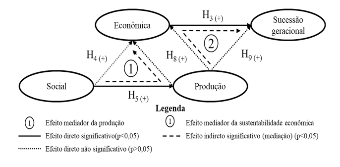 Não existe efeito direto entre a escala de produção e a sucessão geracional, visto que a Hipótese 9 tenha sido rejeitada (Quadro 2). Não se pode afirmar que o aumento da produção em propriedades leiteiras contribui com o aumento da sucessão geracional. Contudo, a sustentabilidade econômica mediou a relação existente entre produção e sucessão geracional (efeito mediador nº 1; Figura 3). Tais resultados indicam que, por meio da melhoria do desempenho econômico, o aumento da produção de propriedades leiteiras contribuiu com o a sucessão geracional. Isso ocorreu devido ao efeito mediador 1 apresentado na Figura 3, indicando que o aumento da escala de produção pode contribuir com o aumento da sucessão familiar. Para que haja maiores possibilidades de sucessão geracional nas propriedades leiteiras, é fundamental que produtores se preocupem e desenvolvam atividades que contribuíam com a melhoria do desempenho econômico e aumento da escala de produção.