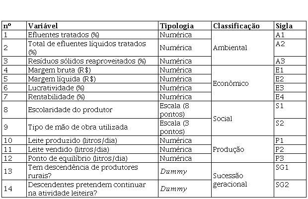 Utilizou-se 14 variáveis, classificadas em cinco agrupamentos: questões ambientais, sociais e econômicas, escala de produção e sucessão geracional (Quadro 1). A definição destas classificações se deu pelos principais achados da literatura, estando em conformidade com as hipóteses definidas para esta pesquisa (Tópico 2). Utilizou-se a Metodologia dos Custos Operacionais (Matsunaga et al., 1976) para calcular: custo operacional efeito (COE): somatório de todos os custos operacionais desembolsáveis; custo operacional total (COT): somatório do COE, depreciações e remuneração da mão de obra familiar; margem bruta e líquida: diferença das receitas totais com o COE e COT, respectivamente. Posteriormente, calculou-se a rentabilidade e a lucratividade das propriedades leiteiras, conforme recomendam Lopes et al. (2011), considerando o percentual da margem líquida sobre as receitas totais e o capital investido, respectivamente. Os indicadores de custo foram utilizados apenas para que se definissem as margens bruta e líquida das propriedades, não sendo utilizados na análise estatística devido à baixa carga (fatorial) externa.