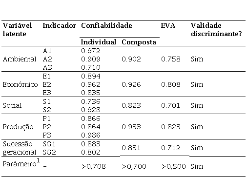 A Tabela 1 apresenta os indicadores de confiabilidade com seus respectivos parâmetros. A análise da validade do modelo foi satisfatória, conforme recomenda a literatura (Tabela 1). A confiabilidade individual (carga externa) evidencia a correlação dos indicadores dentro de um mesmo constructo, devendo ser superior a 0,708 (Hair Júnior, 2018). A confiabilidade composta indica a (possível) existência de eventuais vieses das respostas dentro de um determinado conjunto, devendo ser superior a 0,700 (Hair Júnior, 2018). A validade convergente, ou Average Variance Extracted (AVE) indica o quanto as variáveis latentes se correlacionam com seus respectivos constructos (Hair Júnior, 2018). A validade discriminante indica se um constructo é distinto dos demais. Se for inferior a 0,900, considera-se que seja discriminante, portanto, ideal para a análise (Hair Júnior, 2018).