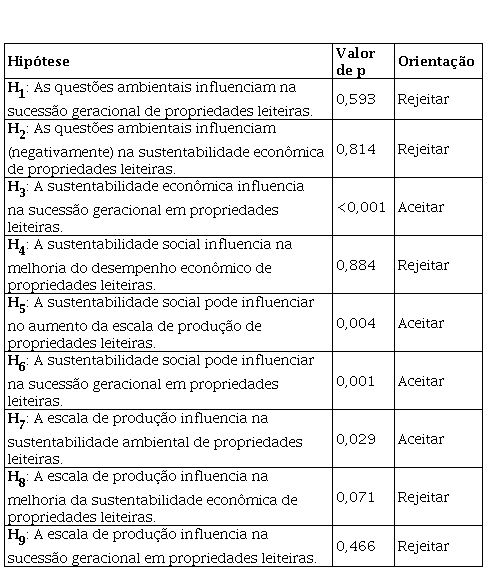 Foi realizado o teste de significância das hipóteses a 5%, apresentado no Quadro 2. A hipótese 1 foi rejeitada por não haver significância estatística (p<0,05), indicando que não se pode constatar a influência das questões ambientais na sucessão geracional. Nesse sentido, não se pode afirmar que propriedades leiteiras ambientalmente sustentáveis apresentem maior possibilidade de sucessão geracional. Nesta pesquisa, a preservação e conservação do meio ambiente não foi um fator determinante para assegurar que haja incentivo na ocorrência da sucessão familiar.