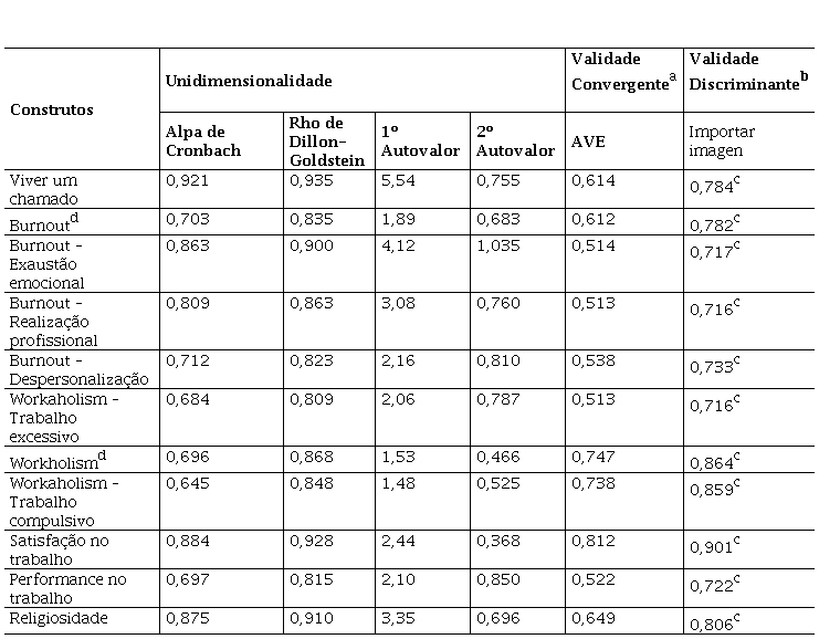 Durante o processamento dos dados foi necessário excluir 16 das 64 variáveis para alcançar níveis adequados para validação dos modelos de mensuração. Inicialmente, foram identificados problemas na unidimensionalidade nos construtos Performance no Trabalho (PT_2 e PT_3) e Trabalho Compulsivo (WO-TC_9); adiante, problemas de validade convergente nos construtos Performance no Trabalho (PT_4, PT_6 e PT_7), Trabalho Excessivo (WO-TE_1, WO-TE_2 e WO-TE_10), Exaustão Emocional (BU-EE_14), Realização Profissional (BU-RP_7 e BU-RP_12) e Despersonalização (BU-DE_15); por fim, problemas da validade discriminante no construto Viver um Chamado (VC_9, VC_10 e VC_11). O ajuste do modelo de mensuração se deu por um processo iterativo, com a reestimação do modelo, avaliando-se o impacto da exclusão das variáveis manifestas na unidimensionalidade, na validade convergente e da validade discriminante.