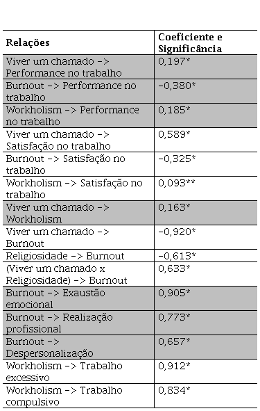Observa-se que todas as relações são significativas ao nível de significância assumido de 0,05. Em relação à Performance no trabalho vê-se que Burnout (-0,380) tem maior efeito relativo em relação à Viver um chamado (0,197) e Workholism (0,185). O efeito de Burnout na Performance no trabalho é negativo, ao passo que o das demais, positivo.