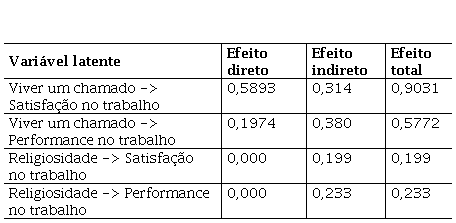 Observa-se que o efeito indireto de Viver um chamado sobre a Satisfação no trabalho é maior do que seu impacto direto. O mesmo não ocorre com o efeito sobre a Performance no trabalho. Isso decorre do efeito indireto da Religiosidade na Satisfação e Performance no trabalho ocorrer em magnitudes diferentes – respectivamente, 0,199 e 0,233.