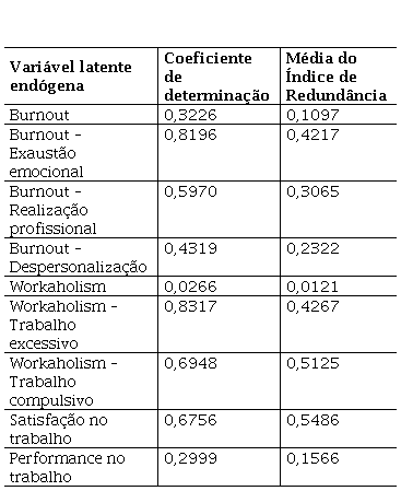 Não se conhece uma gradação consensual para valores do coeficiente de determinação. Por outro lado, da gradação proposta por Cohen (1988) para tamanho de efeito (f²) em ciências comportamentais (0,02 baixo; 0,15 médio; 0,35 alto), os valores do R² podem ser classificados altos, a não ser em relação à Workholism que se classifica como baixo.