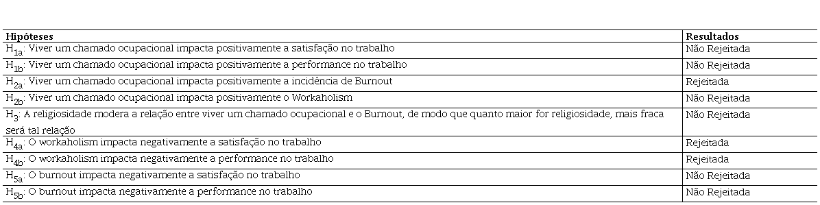Por fim, as hipóteses H5a e H5b também não puderam ser rejeitadas, corroborando a WCT. Os resultados são consistentes com os achados de Maslach, Schaufeli e Leiter (2001), Chung e Han (2014) e Demerouti, Bakker e Leiter (2014). Os achados dão maior robustez ao modelo teórico do chamado ocupacional. Desta forma, como o burnout se relaciona negativamente com a satisfação no trabalho (Chung & Han, 2014; Demerouti, Bakker & Leiter, 2014), os resultados encontrados são consistentes com o proposto pelo modelo teórico do chamado ocupacional.