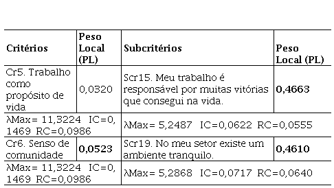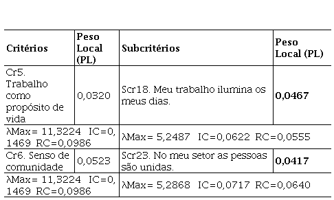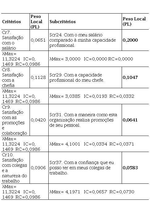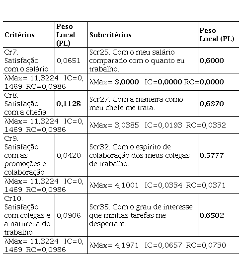 Destarte, ao considerar a satisfação como um elemento que pode influenciar em diversas variáveis organizacionais, a seguir, na Tabela 6, é elucidado os critérios e subcritérios mais priorizados pelos trabalhadores.