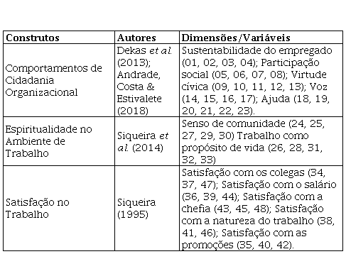 Para segunda parte do questionário, foi utilizado o modelo de Dekas et al. (2013), “Escala de Comportamento de Cidadania Organizacional para Trabalhadores do Conhecimento”, validado no contexto nacional por Andrade, Estivalete e Costa (2018), com 23 questões mensuráveis. Para a terceira parte do questionário, foi utilizado o modelo “Inventário de Espiritualidade no Trabalho (IET)”, desenvolvido e validado por Siqueira et al. (2014), com 10 questões mensuráveis em sua versão reduzida. Para a última parte do questionário, foi utilizado o modelo desenvolvido e validado por Siqueira (1995), “Escala de Satisfação no Trabalho”, com 15 questões mensuráveis. O Quadro 1 apresenta um resumo dos construtos utilizados para a construção do questionário de pesquisa, autores e dimensões/variáveis (número de questões).