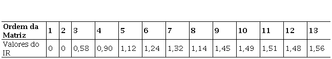 Para compreender a consistência do julgamento, torna-se necessário verificar o Índice de Consistência (IC - Consistency Indexou) e a Razão de Consistência (RC - Consistency Ratio). O IC mensura o grau de inconsistência dos julgamentos paritários. Esse índice é calculado com o emprego do λmax, alcançado por: IC = (λmax – n)/(n-1). Em seguida, realizou-se o seguinte cálculo: RC=IC/IR. O valor do Índice Randômico (IR) foi obtido por meio dados apresentados na Tabela 2.
