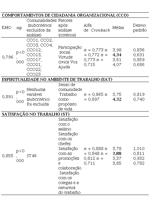 Com base na Tabela 3, é possível observar que os testes para os CCO, revelaram valores satisfatórios do KMO e de significância. Na análise da comunalidades, de 10 variáveis (subcritérios) foram excluídos, sendo que o fator (critério) “sustentabilidade do empregado” foi removido da análise pelo valor das comunalidades ser menor que 0,5. Os valores de alfa de Cronbach demonstram valores acima de 0,7, o que indica boa confiabilidade (Hair et al., 2009). Também é plausível mencionar que as cargas fatoriais, com teste aplicado pela técnica Varimax, dos itens variaram no continuum de valores entre 0,5 e 0,8. O fator ajuda, apresenta poder de explicação de 67,64% de variância do construto. Com relação às médias, nota-se o maior valor para “virtude cívica (4,34)” e “ajuda (4,07)”. Isto sugere que são os comportamentos mais praticados pelos trabalhadores da prefeitura.