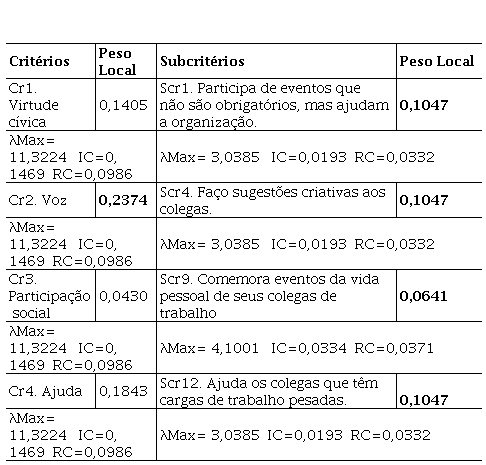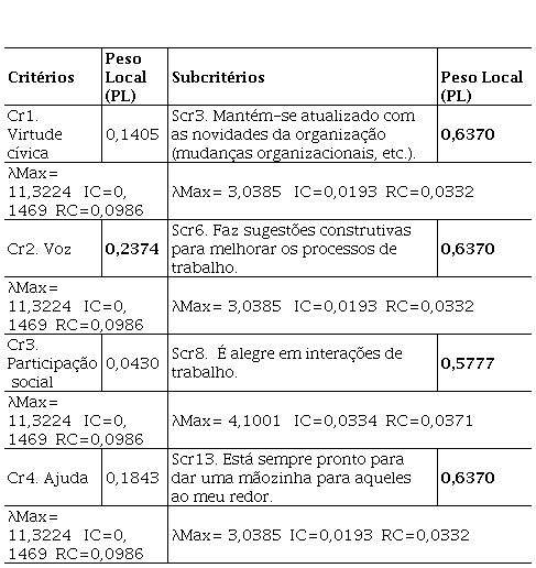 Os dados revelam que todos os critérios e subcritérios obtiveram RC<0,10, atendendo as exigências de Saaty (2008). Assim, o maior critério priorizado pelos trabalhadores é Voz (PL=0,2374). Isto sugere que os trabalhadores percebem que a prefeitura em questão fornece meios para que possam expressar suas opiniões e fazer contribuições para a rotina organizacional. Dekas et al. (2013) sugere que a voz, enquanto uma dimensão dos CCO, sinaliza toda e qualquer contribuição que o trabalhador faz para o seu trabalho. Seguindo, pode-se notar que houve três subcritérios (Scr), mais priorizados pelos trabalhadores, a saber: Scr3, PL=0,6370; Scr6, PL=0,6370; Sc13, PL=0,6370). Assim, é possível inferir que os trabalhadores se envolvem nos CCO, englobando ações pertinentes ao interesse em se manter atualizado frente às mudanças enfrentadas pela prefeitura, sugestões para melhorar o trabalho e os processos organizacionais e estão dispostos a dar uma “mãozinha” aos seus colegas de trabalho. Vale ressaltar, que no critério Participação social, os trabalhadores se envolvem em interações do trabalho e percebem que são alegres nestes momentos. De acordo com Organ (2018), compreender estes comportamentos espontâneos e cooperativos, contribui não só para o desenvolvimento pessoal e profissional do indivíduo, mas de toda a organização (Geus et al., 2020; Andrade et al., 2021).