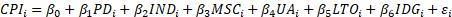 CPI = Corruption Perceptions Index of country i; PD = Power Distance of country i; IND = Individualism of country i; MSC = Masculinity of country i; UA = Uncertainty Aversion of country i; LTO = Long-Term Orientation of country i; IDG = Indulgence of country i; and