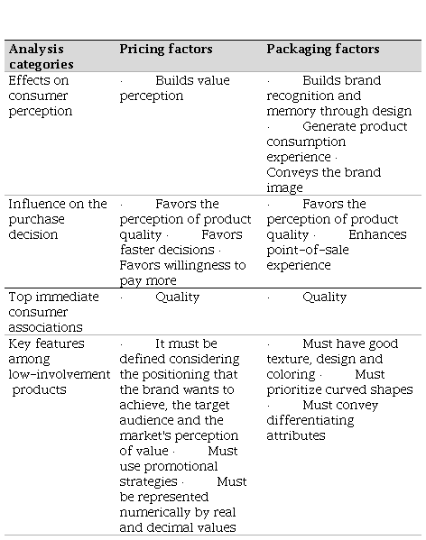As for the influence of price and packaging on the purchase decision, participants indicated that both have influence through causal relationships and correlation between perception and emotion variables. If the packaging is of good quality and well prepared, a brand may, for example, have a better-defined positioning and it is possible that the consumer will start to associate it with higher prices than the average price for a given product category. With this, the brand can present greater congruence between the real price of a product and the price associated with the consumer's perception of value in relation to this same item.