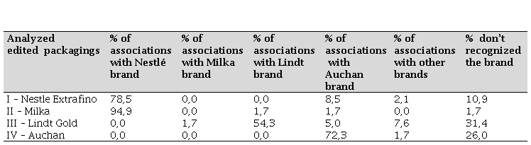 In this sense, although brand recognition is the main element for the purchase choice (Keller, 2016), when removing its explicit identification from the chocolate tablet packaging, the other elements emphasized through the packaging were insufficient for a more effective brand recognition, especially among Lindt, Auchan that seek to position themselves as a premium brand and a low-cost brand, respectively.