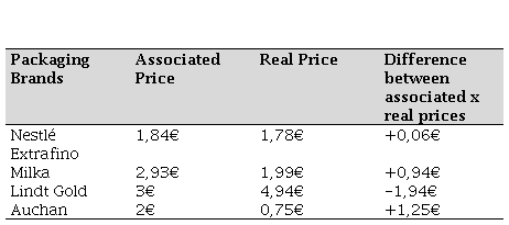 In general, it was possible to identify significant differences between the average price values that the sample attributed to the chocolates based on the packaging and the actual price practiced by the brands in the market. The packaging that is associated with the highest price is that of Lindt Gold (3€), which is not entirely positive since the difference with the real price is negative: -1.94€. Secondly, the packaging of Milka chocolate has a higher associated average price (2.93€), which is favorable to the brand, as it revealed an elasticity of 0.94€ in relation to the actual price of the product.
