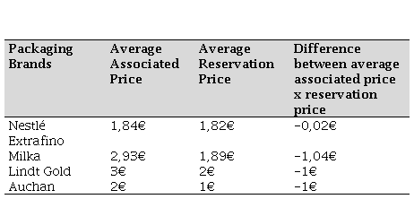 For the Milka, Lindt and Auchan brands, the difference between the associated average price and the reserve price explains limitations in the use of packaging in the process of distinguishing and recognizing the brand, and consequent favorable price associations made by the consumer. With that, it becomes necessary for these brands to review their strategies and incorporate elements that contribute to the development of product quality and identity associations (Rodríguez et al., 2022). In addition, it converges with the results obtained in the observation of displays in supermarkets, by facilitating the use of the product and by differentiating the consumer experience at the point of sale (Rundh, 2016; Gómez et al., 2015).