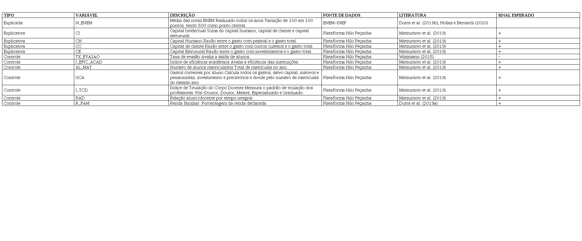 Já os dados do Capital Intelectual, bem como seus componentes, capital humano, capital de cliente e capital estrutural foram extraídos da plataforma Nilo Peçanha. Nessa plataforma também foram retiradas as variáveis de controle compostas pela taxa de evasão, número de alunos matriculados, gastos correntes por aluno, índice de titulação do corpo docente, relação aluno/docente por tempo integral e renda familiar, a utilização dessas variáveis de controle segue os estudos de Thomaz et al. (2014); Wissmann (2015); Matsumoto et al. (2019) e Dutra et al. (2019).