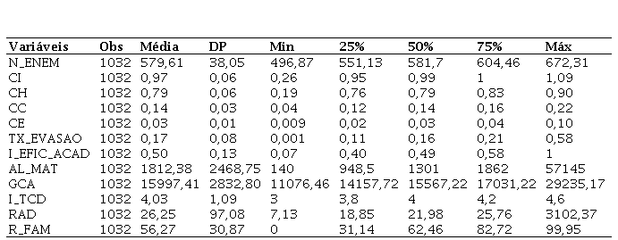 De modo geral, foram validadas 1032 observações dos 38 Institutos Federais. Foi realizada uma winsorização em relação às notas do ENEM e das variáveis financeiras, como o GCA, incluindo gastos com pessoal, gastos com outros custeios, gastos com investimentos e gastos total que serviram de base para gerar as variáveis explicativas CH, CC e CE no intuito de tratar os outliers.