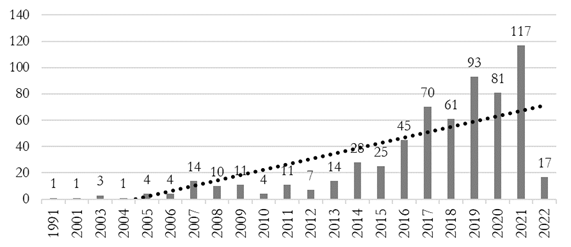In order to present the direction of the research, we display the WOS database publications by year using a frequency chart (Picture 1), considering the 622 delimited papers that represent the field of study. Considering the period between 1991 to March 2022, it is noticed that the research about EE, IE and BE is relatively recent. While the first paper was published in 1991, the second was published only in 2001, about ten years after the first publication. In addition to that, up to 2006, the number of publications may be considered small, not different from the other years, showing rapid growth only after 2014. Starting in 2014, the number of publications went from 28 to 117 in 2021, the year with the greatest number of publications in the historical data series.