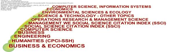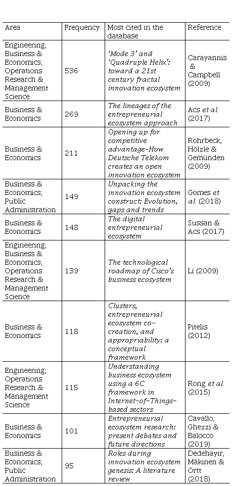 It is worth mentioning, in Picture 4, the representativity of indexed publications specifically in the Business and Economy categories. The others, in its majority, permeate categories that involve social, human and technological matters. It is important to highlight that there were no indexed papers in the Public Administration category. This fact emphasizes the importance of looking at the ecosystems through an approach that considers the Public Administration.