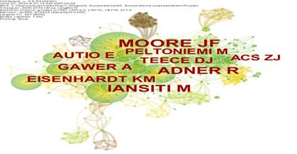 When examining the intellectual basis of the research field, we observed that among the network of authors cited, three were the most prominent: Moore (2008); Adner (2008) and Iansiti (2006). About the co-citation network, they indicate a connection with the original area of the field, which comprises strategic and regional development. This suggests that we can’t understand the topics of EE, EI and EN in isolation, and that they are intrinsically related to business strategies and regional development.