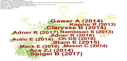 When most of the inside analysis of the base papers was done, the study raised the most cited authors in the network comprising the 622 papers. The most cited author from the analyzed base, with a frequency of 150 times and a high level of centrality, Moore (2008) appears at the top of the ranking, ordered according to criteria determined by citation count and influence on the field. Over 10 (ten) years after the publication. The second most cited is Adner (2008), holding a 102-time frequency and a high level of centrality, and, lastly, Iansiti (2006), in the third collocation, with a 98-time frequency and high level of centrality.