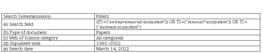 Thus, to execute the search, the terms used were “entrepreneurial ecosystem”, “innovat* ecosystem” and “business ecosystem”, in between quotation marks to find the complete terms. The terms should be on the papers’ titles. The search included all years from the database up to March 2022, all languages and categories, and used a filter that included only scientific papers, disregarding other types of productions — this was used because scientific papers are blindly reviewed by peers. By the end of the filtering process, 622 papers were available. Following the used framework and the CiteSpace analysis, the papers’ references were downloaded and exported in two formats: spreadsheet and text (Chen, 2006; Prado et al., 2016). Throughout the whole process, the data structuring and systematization happened.