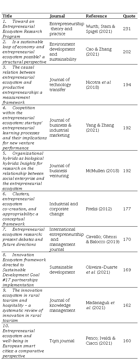 The seminal paper was published in 1991 and the title is Applying The New Set Of Lenses - Implications For Managers Of Managing In The Business Ecosystem (Zeleny; Cornet & Stoner, 1991). In the next 10 years, no papers were published in this field of research. In the first decades after 2001, only two texts were cited at least 50 times: Opening up for competitive advantage - How Deutsche Telekom creates an open innovation ecosystem (Rohrbeck; Holzle & Gemunden, 2009), with 50 citations, and 'Mode 3' and 'Quadruple Helix': toward a 21st century fractal innovation ecosystem (Carayannis & Campbell, 2009), with 88 citations. Adding to these few publications, the papers that extrapolate over 190 citations were published only after 2018: Yang and Zhang (2021), and McMullen (2018), both with 192 citations; Nicotra et al. (2018) with 194 citations; Cao and Zhang (2021) with 202 citations; Wurth et al., (2021) with 231 citations, the greatest number of citations in the historic series. The chart in Picture 1 teaches us that the research regarding EE, IE and BE is ongoing since the 90’s, however, it has been widely approached only recently, specifically since 2014.