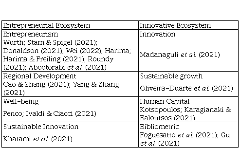 Yang and Zhang (2021) consider the ecosystem as “the alignment structure of the multilateral set of partners that need to interact for a focal value proposition materializes”. Based on the Resource Based View (RBV), it is possible to capacitate the entrepreneurial activities and ease the startup growth, since it may need some key resources. McMullen (2018) understands the EE as a system of discovery and search for entrepreneurial opportunities. Cavallo, Ghezzi and Balocco (2019) understand the BE as a network of interconnected organizations that, probably, operate around a focal company or platform. According to Oliveira-Duarte et al. (2021), the IE is a dynamic deliberate network with complex relations based on trust, value and technology co-creation, and complementary competencies. Penco, Ivaldi and Ciacci (2021) understand that the EE, based on systemic ecological thinking, regards the interdependency of actors from a certain community, aiming to create new value. Emphasizing the interdependency between actors and factors, follows the regional development research, and the strategy literature.