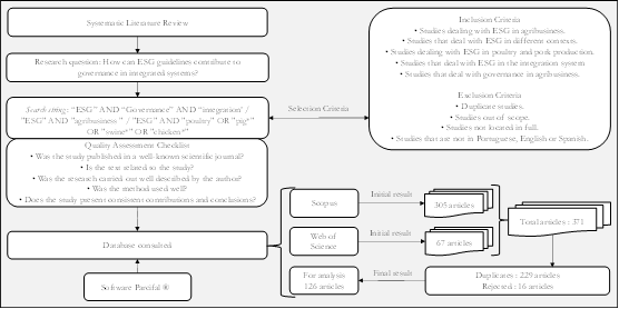 This study is a Systematic Literature Review on ESG, governance, integration and agribusiness. The search strings “ESG” AND “Governance” AND “integration”, "ESG" AND "agribusiness" and "ESG" AND "poultry" OR "pig*" OR "swine*" OR "chicken*" were used. The search was performed on July 27, 2023, using the Parsifal® software in the Scopus and Web of Science databases (Kitchenham & Charters, 2007). The files were imported from the Parsifal® Software in BibteX format and totaled 371 articles. After excluding duplicates (229 articles) and rejected ones (16 articles), a total of 126 articles were analyzed in full. Figure 1 shows the execution of actions to carry out the work.