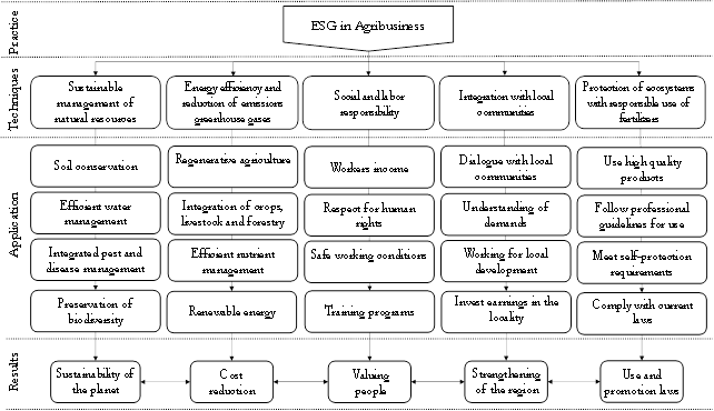 Thinking about ESG as a way to integrate systems for the sustainable development of agribusiness requires an integral approach, which considers not only productivity and profitability, but also the entire impact arising from its operations (Sciarelli et al., 2021). The adoption of ESG practices in agribusiness, therefore, is fundamental and it is important to remember that they also bring benefits to all those involved, who can improve their reputation, attract investments, minimize challenges and foster technological innovation (Wu et al., 2022).