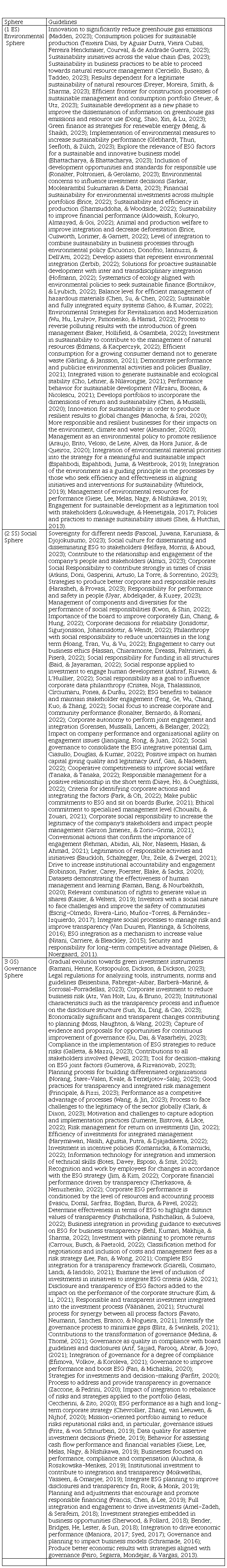 ESG guidelines as guidelines for decision-making in a given area, process or activity establish conduct drivers that cover 3 spheres, environmental, social and governance. We cited 126 guidelines highlighted by the authors of the systematic literature review, of which 38 were in the environmental sphere, 35 in the social sphere and 53 in the governance sphere. All guidelines contribute to promoting and enhancing strategies to increase companies' resilience and build a stronger brand with increased market value. The results show that ESG has been growing since 2019 and the results show that it is important to manage and face market challenges.