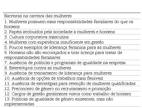 Como observado, barreiras na construção da carreira de mulheres são existentes. Na literatura científica, as barreiras de carreira podem ser definidas como as condições que dificultam o progresso na carreira, no indivíduo ou em seu ambiente (Swanson & Woitke, 1997). Conforme Swanson e Woitke (1997), as barreiras podem ser superadas, mas estão condicionadas ao grau de dificuldade percebido pelo indivíduo e às características deste. A Organização Internacional do Trabalho (OIT) consolidou a classificação das barreiras mais significativas em ordem de prioridade, segundo relato das empresas pesquisadas em relatório publicado pela agência (OIT, 2015, p. 16), conforme Tabela 1.
