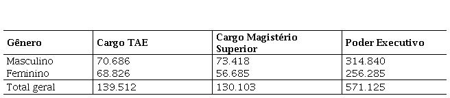 O Painel Estatístico de Pessoal1 (PEP) disponibiliza um panorama atualizado com informações estatísticas da área de Gestão de Pessoas do Governo Federal. Dados extraídos em julho de 2022 apontaram que há 571.125 servidores ativos no poder executivo federal. Destes, destacaram-se as carreiras dos Técnico-Administrativos em Educação (TAE) com 139.512 servidores, seguido pela carreira do Magistério Superior com 130.103 servidores, os quais possuem maior expressividade no executivo federal. Juntos, representam 47,20% do quantitativo total, conforme revelam os números sintetizados na Tabela 2. Cabe destacar que a composição do quadro de pessoal das Universidades Federais e Institutos Federais contam com apenas duas carreiras, a do Magistério Superior e a dos TAE. O servidor TAE é o agente responsável pelas atividades técnico-administrativas das instituições de ensino. Já os servidores do Magistério Superior são docentes, responsáveis pelo processo de aprendizagem dos alunos (Junior & Martins, 2021).