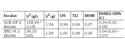 A AFC foi utilizada para avaliar as estruturas internas propostas nos modelos de cada escala utilizada, e os resultados estão demonstrados na Tabela 3.