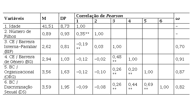 Na escala de crenças e estereótipos ao desenvolvimento profissional feminino, o valor médio para a dimensão de barreira de gênero foi superior a de barreira interna-familiar. Já na escala de barreiras de carreira, os valores médios foram muito próximos para as duas dimensões. Nas análises de correlações, a idade se correlacionou de forma significativa e positiva com o número de filhos indicado pelas mulheres (r = 0,35; p<0,01). Com os construtos, se correlacionou de forma significativa e negativa com CE/Barreira Interna-Familiar (r = -0,19; p<0,01). O número de filhos não se correlacionou de forma significativa com as demais variáveis.