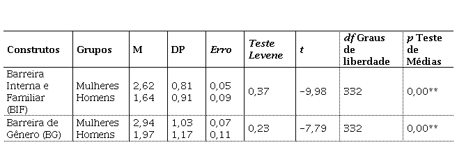De forma prévia ao teste de médias, a confiabilidade das dimensões analisadas para as respostas dos homens foi avaliada como critério para a sequência dos testes. Para as duas dimensões, os valores foram considerados excelentes, a saber: Barreira Interna e Familiar, com os 7 itens (ω = 0,84); e, Barreira de Gênero, com 10 itens (ω = 0,94).