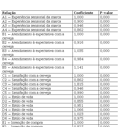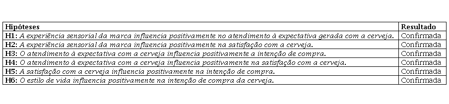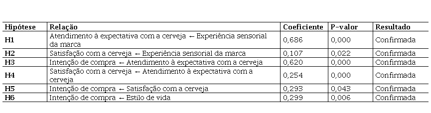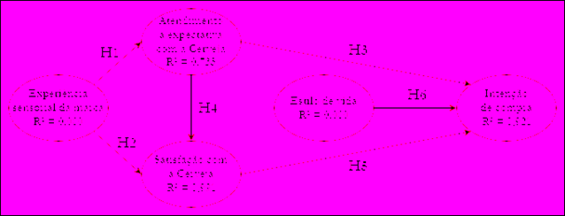 O modelo final apresentado indica que a expectativa com a cerveja é explicada 73,3% (R² = 0,733) pela experiência sensorial da marca. A satisfação com a cerveja e a intenção de compra obtiveram valores de regressão próximos, mas a satisfação é explicada em 99,1% (R² = 0,991) pela experiência sensorial da marca e pela expectativa com a cerveja, e a intenção de compra é explicada em 92,1% (R² = 0,921) pela expectativa com a cerveja e pela própria satisfação com a cerveja.