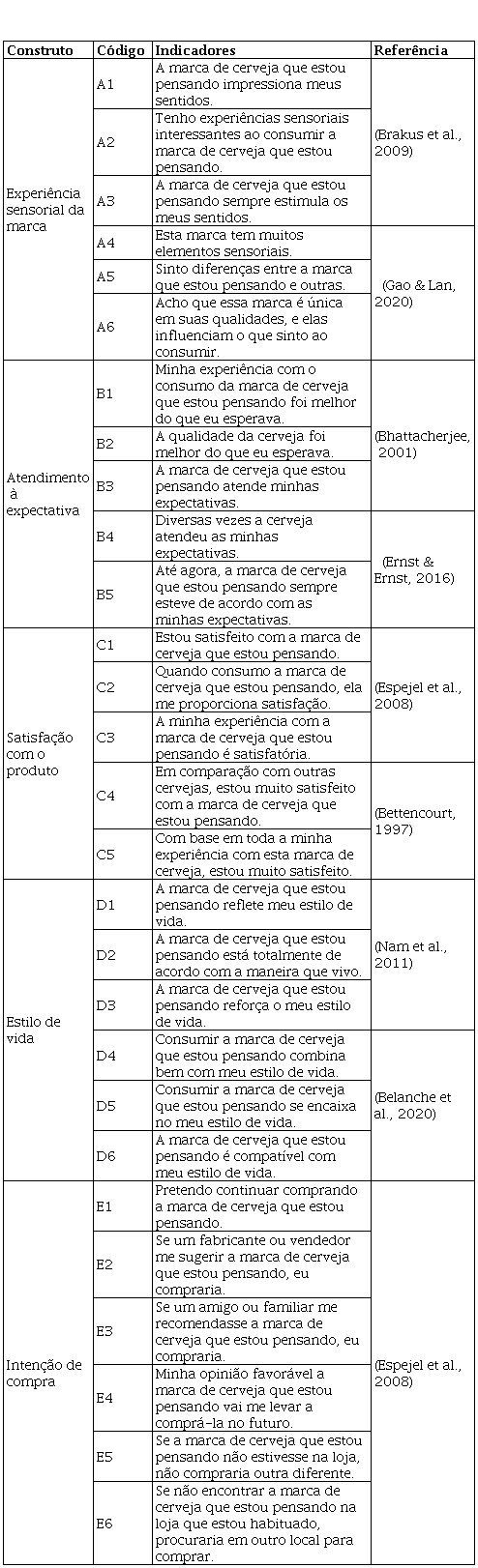 O questionário teve inicialmente três questões filtro para a seleção dos pesquisados, sendo elas: “a) Você tem 18 anos ou mais?”; “b) Você já consumiu cerveja artesanal?”; “c) Qual marca de cerveja artesanal você já consumiu?”. Em um segundo momento foram apresentadas de forma aleatória as perguntas que compõem as escalas pré validadas academicamente e adaptadas ao presente trabalho (quadro 1). Foi utilizada uma escala Likert de cinco pontos para mensurar os itens, indo de “discordo fortemente” (1), “discordo” (2), “não concordo ou discordo” (3), “concordo” (4) e “concordo fortemente” (5). As questões relativas ao perfil da amostra foram abordadas na terceira etapa do questionário. Os entrevistados puderam responder questionamentos relativos à idade, gênero, localidade, faixa etária e faixa de renda.