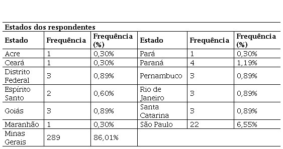 Os dados da tabela 1 permitem observar que o estado com maior número de respondentes é Minas Gerais com 86,01% das pessoas, seguida por São Paulo com 6,55% e o Paraná com 1,19%.