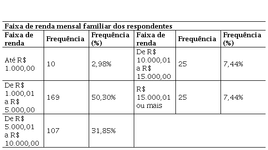 A terceira tabela demonstra a frequência referente à faixa de renda mensal familiar dos participantes da pesquisa: