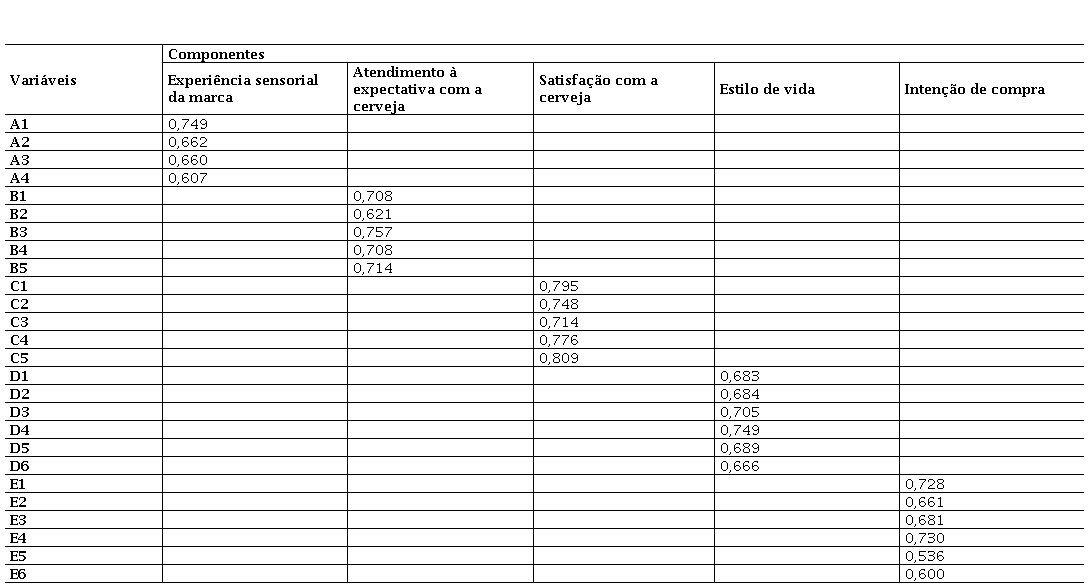 A tabela 4 mostra que as variáveis independentes agruparam-se nos cinco construtos do modelo. Adicionalmente, por meio da AFE pôde-se observar que as variáveis A5 com 0,460 e A6 com 0,416 apresentaram baixas comunalidades. Com isso, ponderou-se pela retirada das mesmas.