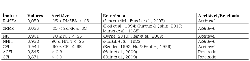 Para avaliar o ajuste do modelo, foram consideradas as medidas de ajuste absoluto, incremental e parcimonioso (Hair et al., 2009), que são demonstradas na tabela 5: