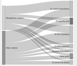 finances for the categories of other goals (13.5%), to travel with family (5.8%) and no specific goal (17.3%) was also lower compared to students of other fields, in which the proportions were 22.8%, 22.2% and 25.5%, respectively. Moreover, the planning goals of to control expenditure, to help somebody and to travel with school presented similar proportions between both groups of students, being, respectively, 51.9%, 13.5% and 7.7% for management students and 48.3%, 15.4% and 10.7% for non-management students.