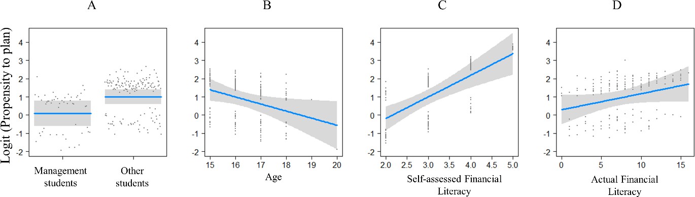 The results revealed that self-assessed financial literacy was positively associated to propensity to plan, showing that students who self-rated as high level of financial literacy tend to behave as planners (Model A: β= 0.878, P<0.01; Model B: β= 0.934, P<0.01 in Table 2) (Fig. 2-C). In addition, actual financial literacy was also positively associated to the propensity to plan of students (β= 0.309, P<0.10 in Table 2) (Fig. 2-D), but this effect was less accentuated than self-assessed financial literacy, indicated by its lower coefficient. Amongst the management students with 16 years old and intermediated actual financial literacy, students who self-rated their financial literacy as intermediate (i.e., 3) obtained 27.3% more propensity to plan than those with low self-rated financial literacy (i.e., 2). Actual financial literacy increased the propensity to plan in 8.8% among management students with 16 years old and intermediate level of self-rated financial literacy. The findings here indicated that self-assessed and actual financial literacy were both associated to propensity to plan. Previous studies showed that individual tend to overestimate their own financial literacy (Okomoto & Komamura, 2021; Lusardi & Mitchell, 2014), but self-assessed financial literacy had a higher effect on propensity to plan than actual financial literacy, indicated by the difference between coefficients. The more accentuated effect of self- assessed financial literacy on the propensity to plan corroborates to previous studies, in which individuals with higher confidence in their personal finance knowledge are more likely to plan for retirement (Scheresberg, 2013). Indeed, self-confidence people have less psychological barriers to get new information in order to develop planning strategies (Rooij et al., 2012). Consequently, self-assessed financial literacy is an important driver of financial behavior and well-being (Sabri et al., 2022).
