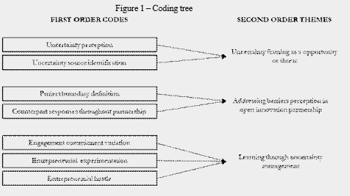 The focus of this research is to explore the learning processes of entrepreneurs in contexts of perceived uncertainty. In this research, the methodological alignments provide rigor to the analytical process by blending two methodological devices: the use of Glaser & Strauss’s Grounded Theory emergent data coding (Creswell, 2014) and structured data analysis based on the Gioia Method (Gioia et al., 2013). One of the main challenges of this type of approach, honoring its process specificity, is to encompass not only a sequential description of events but also to increase the complexity in the analysis of multiple cases. As a strategy, we will incorporate the methodological recommendation of Abdallah et al.(2019), which suggests analyzing the cases in parallel using the same narrative alignments, supporting the process with illustrative data for each case. For this, timelines will be built for each project, reflecting the most relevant events of each case. Once the cases were mapped, the inductive coding process began. This process resulted in the coding tree (Figure 1). Three second-order themes emerged from the data analysis in order to explore the patterns by which entrepreneurs manage uncertainties and learning during startup and corporate partnerships: Uncertainty framing as an opportunity or threat, Learning through uncertainty management, and Alignment/misalignment in front of uncertainty management responses.