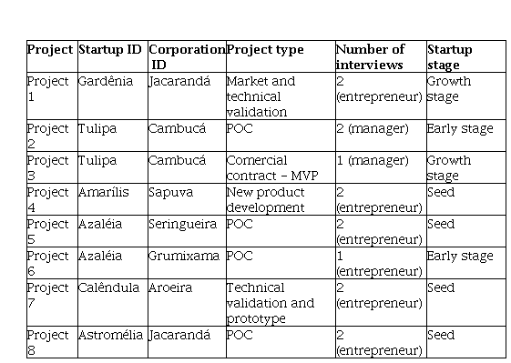 The 39 interviews were carried out, in which 14 were applied to corporation managers or open innovation institution’ managers, in order to identify relevant elements for the protocol validation and also to facilitate connections with entrepreneurs. From the startup side, 19 interviews were carried out: 14 with entrepreneurs, and 5 with startup decision-makers managers. Considering the selection criteria specified above, finally, 14 interviews were considered for the analysis stage. These 14 interviews were