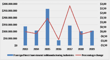 The study maintains a focus on the manufacturing sector in Ecuador because it is an important pillar of the country's economic companies. This is because it represents a transcendental and vital component in the productive structure and at the same time is a fundamental element in the economic development of the country (UDLA, 2018). The manufacturing industry was the second sector that obtained the most income from FDI in the study period. This income is comprised of capital contributions, reinvested earnings, and intercompany loans. Among this peri, 2015 and 2016 stand out as the years with the most influential variations. On the one hand, in 2015 the highest FDI income was obtained, with a variation of 144%concerningo the previous year. On the other hand, in 2016 the income decreased by -86% concerning 2015, showing this year the lowest figure for FDI (ECLAC, Economic Commission for Latin America and the Caribbean, 2019). To better understand the information, Figure 1 is presented.