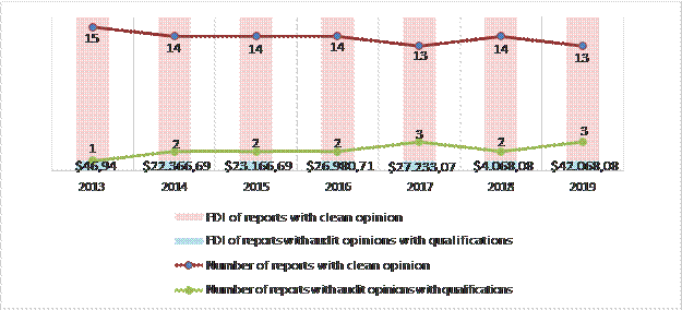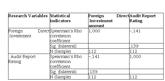 In the study results, there is no dependency between the rating of the audit report and the amount of direct foreign investment because statistical significance is not reflected. Although no research was found where the two variables of this article are correlated, documents are referring to audit reports as