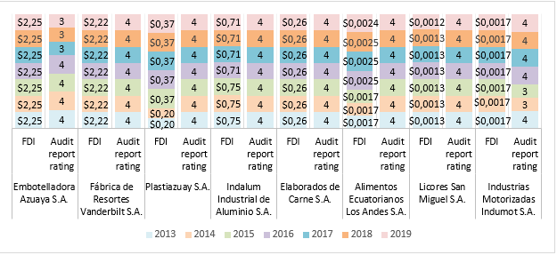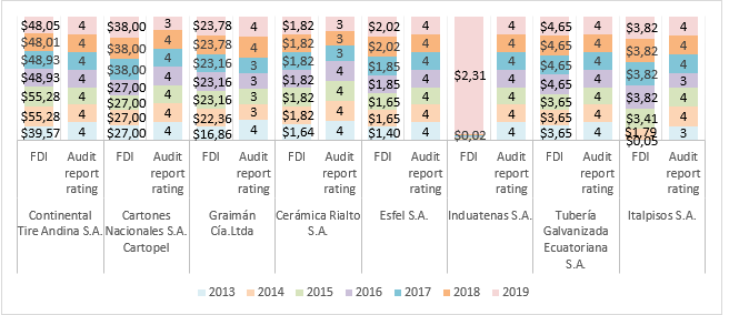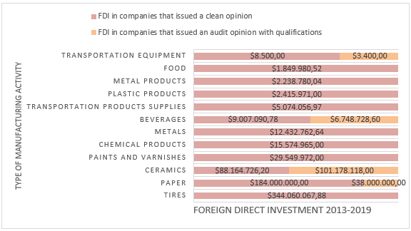 The results obtained from the analysis of the information showed that one-hundred twelve audit reports were obtained. This was a product of the sixteen manufacturing companies for the seven years of study. Of the one-hundred twelve reports, ninety-seven correspond to a clean report and fifteen correspond to a qualified opinion. It is important to mention that none of the companies that were the subject of the study obtained an audit report with an adverse opinion or a disclaimer. On the other hand, the amount of FDI from manufacturing entities during the 2013-2019 period was a total of