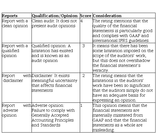 In this context, ISA 700 (2016), mentions that a clean or favorable opinion indicates that the quality of the financial statements is very good, given that they comply with Generally Accepted Accounting Principles (GAAP) and that they have been prepared in all material respects applying all international guidelines such as International Financial Reporting Standards (IFRS). ISA 705 (2016) mentions that a qualified opinion means that the financial statements contain some material deviation or limitation imposed on the scope of the auditors' work, but that this, does not affect the veracity of the financial information. An adverse or unfavorable opinion specifies that there is sufficient appropriate audit evidence that indicates that the misstatements in the financial statements are material because they contain deviations from Generally Accepted Accounting Principles. Finally, refusing an opinion indicates that the limitations imposed on the scope of the auditors' work have been so significant that the auditors do not have an adequate and reasonable basis for expressing an opinion (International Federation of Accountants, 2016). In addition, the study conducted by Bruns & Cott (1998), explains that the clean opinion is what a company requires, being the best opinion, whereas, the following opinions express different situations, with different degrees of importance.